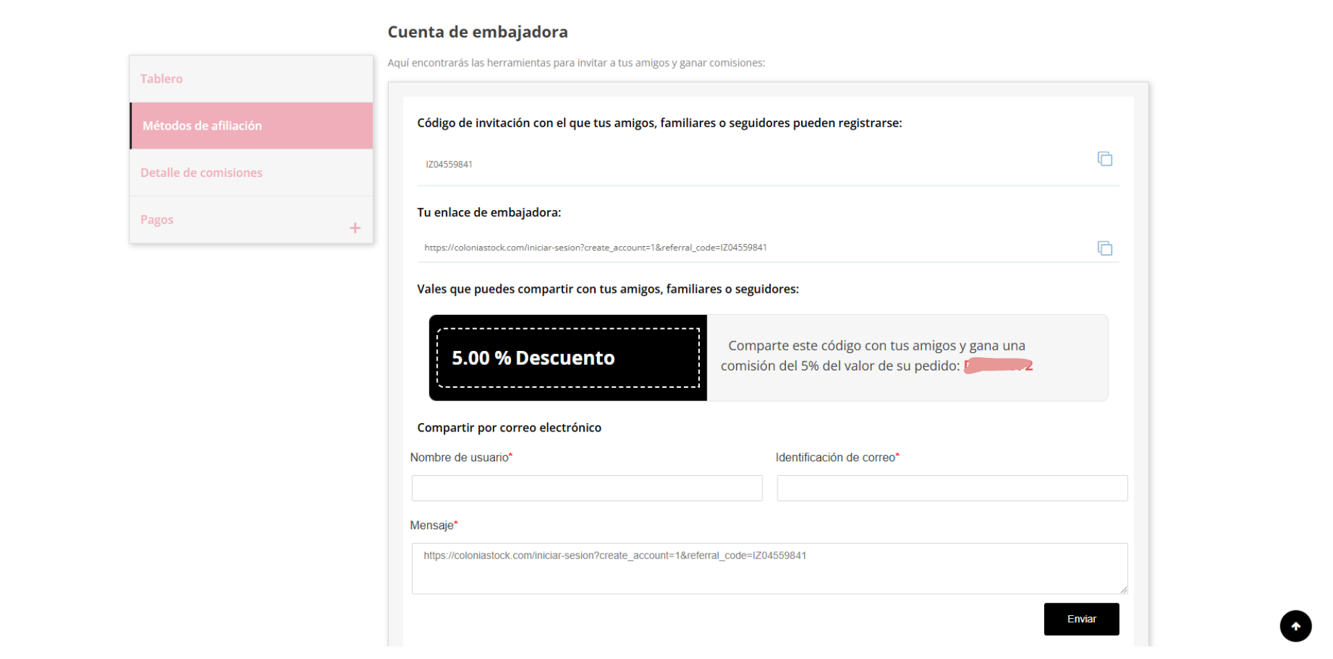 Recibirás un código de descuento del 5% para que compartas con tus amigos, familiares o seguidores en redes sociales. Además, tendrás un enlace de afiliado único y un código de invitación para que puedas promocionar nuestros productos de forma personalizada.