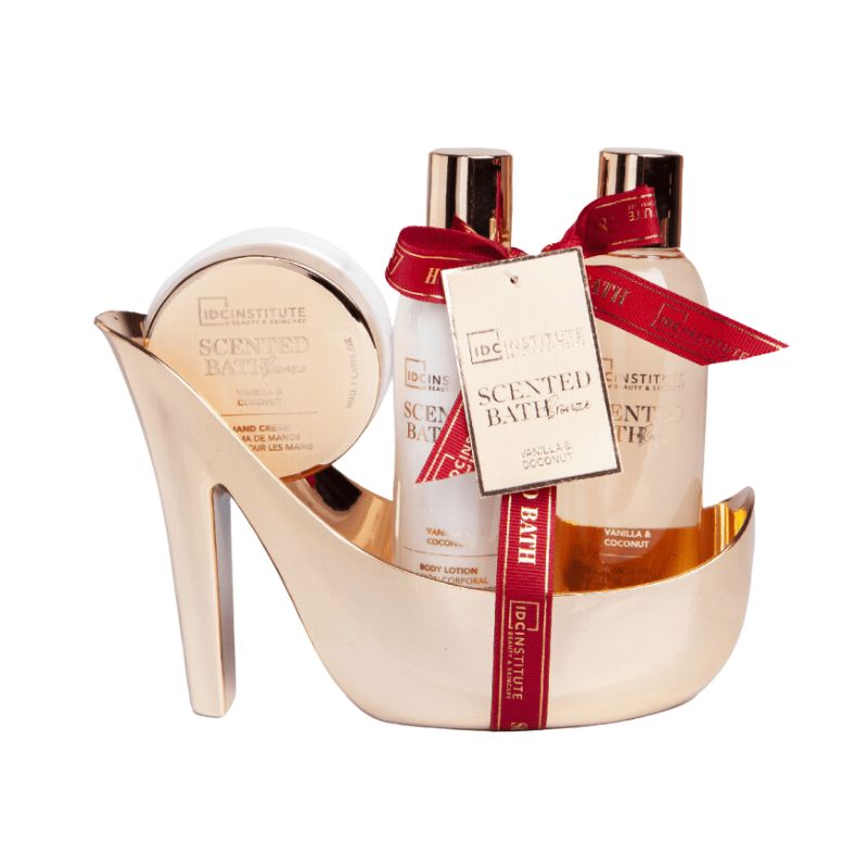 Presentamos IDC Institute Scented Bath Bronze Set Tacón vainilla & coconut de Gel de ducha de 180 ml, body lotion de 180 ml, crema de manos 50 ml.
